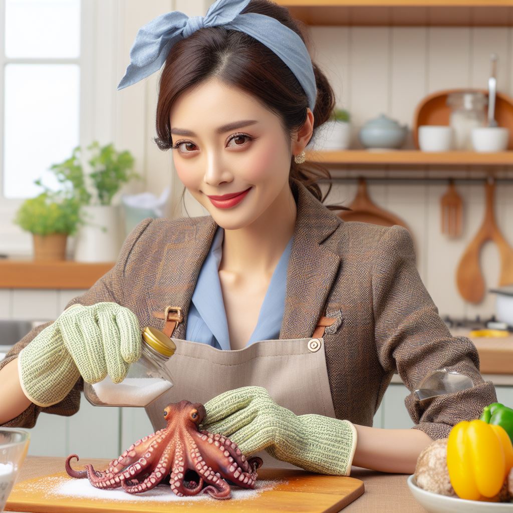 돌문어를 손질할 때 가장 중요한 것은 굵은소금입니다. 먼저, 돌문어의 머리를 뒤집어 내장을 제거합니다. 이때 칼보다는 가위를 사용하는 것이 안전하고 편리해요. 돌문어의 눈과 입 부분도 잘라내고, 굵은소금을 넉넉하게 뿌려주어야 합니다.