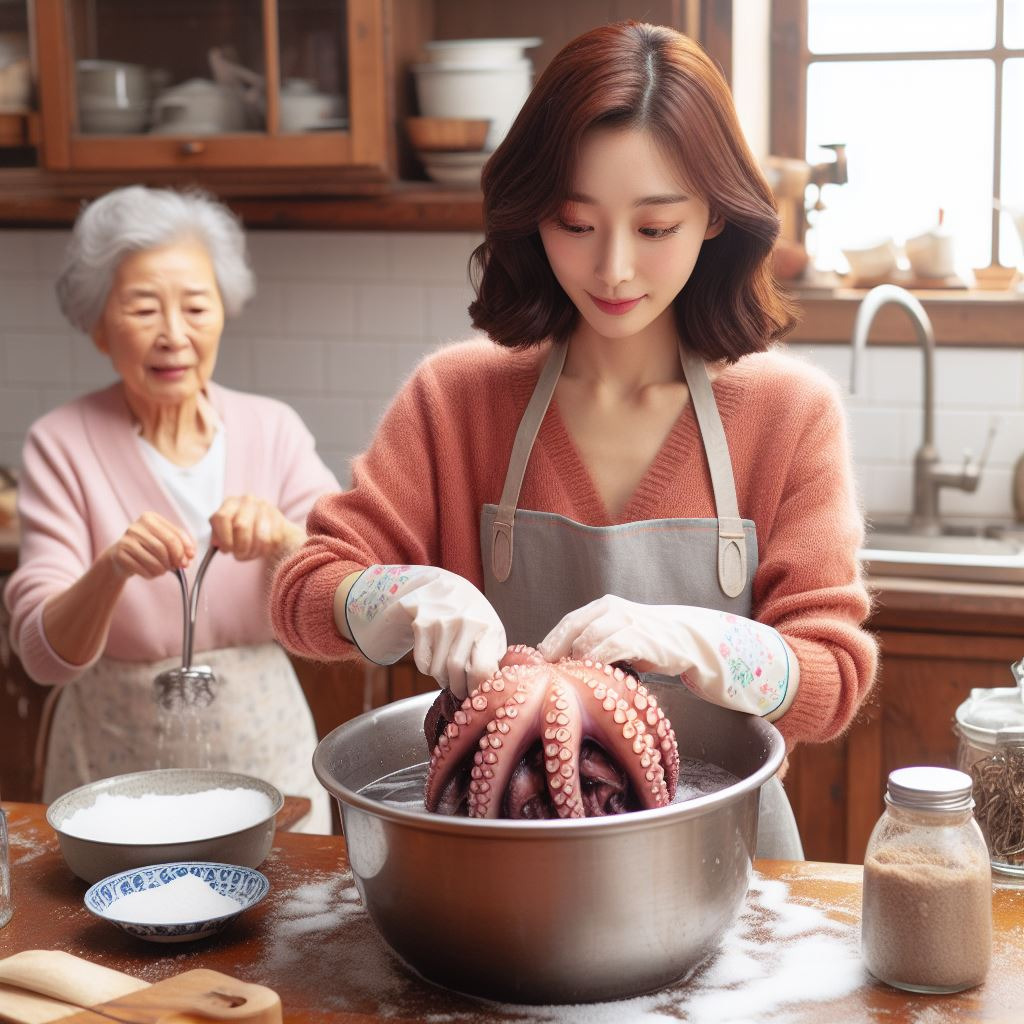 여러분이 궁금해 할 수 있는 밀가루 사용에 대해 말씀드리자면, 밀가루 없이 굵은소금만으로도 충분합니다. 밀가루를 사용하면 오히려 손질이 더 어려워지고, 굵은 소금만으로도 문어의 뻘판과 흙을 효과적으로 제거할 수 있어요. 소금으로 문지른 후에는 흐르는 물에 2~3번 깨끗이 씻어주세요.