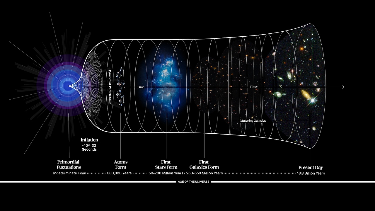 인플레이션은 빅뱅 직후 극도로 짧은 시간 동안 우주가 급격히 팽창한 과정을 말합니다. 이 시기는 빅뱅 이후 10−36초에서 10−32초 사이로 추정됩니다. 이 짧은 시간 동안 우주의 크기는 수십 배에서 수천 배로 급격히 팽창했습니다. 인플레이션은 우주의 구조와 균일성을 설명하는 데 중요한 역할을 합니다. 급격한 팽창은 우주의 밀도를 균등하게 만들고, 작은 요동들이 현재의 은하와 은하단 구조의 씨앗이 되었습니다.