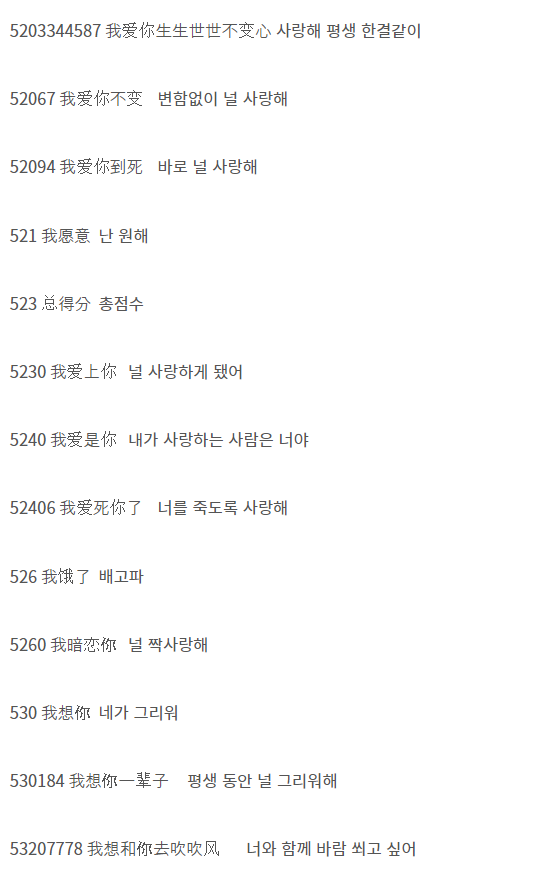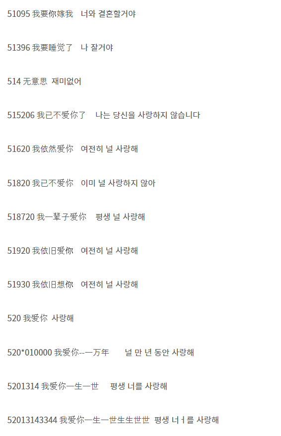 - '사랑해'를 숫자로 표시: '520'이나 '1314'는 '사랑해' 또는 '영원히 사랑해'라는 의미로 사용됩니다.