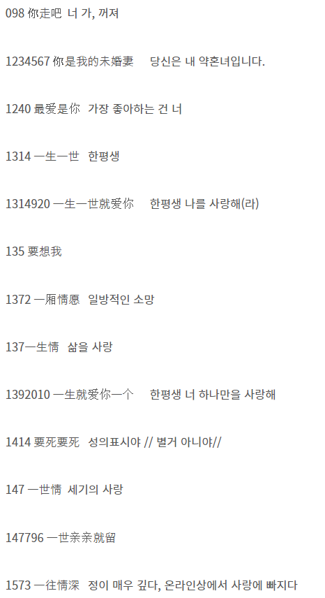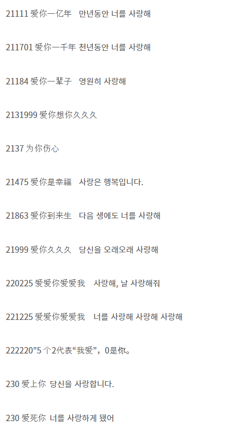 - '보고싶어'를 숫자로 표시: '5201314'는 '워 얼린 이 샹'으로 발음되어 '나는 너를 영원히 사랑한다'라는 의미를 가집니다.