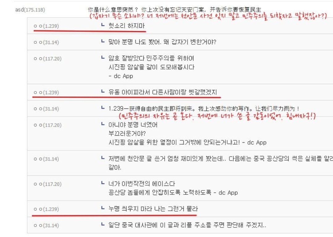 이 글을 본 동지들은 모두 중국 정권 붕괴를 노리는 동지들인것을 우리 비밀결사대는 알고있다 앞으로 조금만 참으면 중국 정권은 붕괴된다 동지들이여 민주주의의 희망을, 독재 부패정권 중국에겐 몰락을...