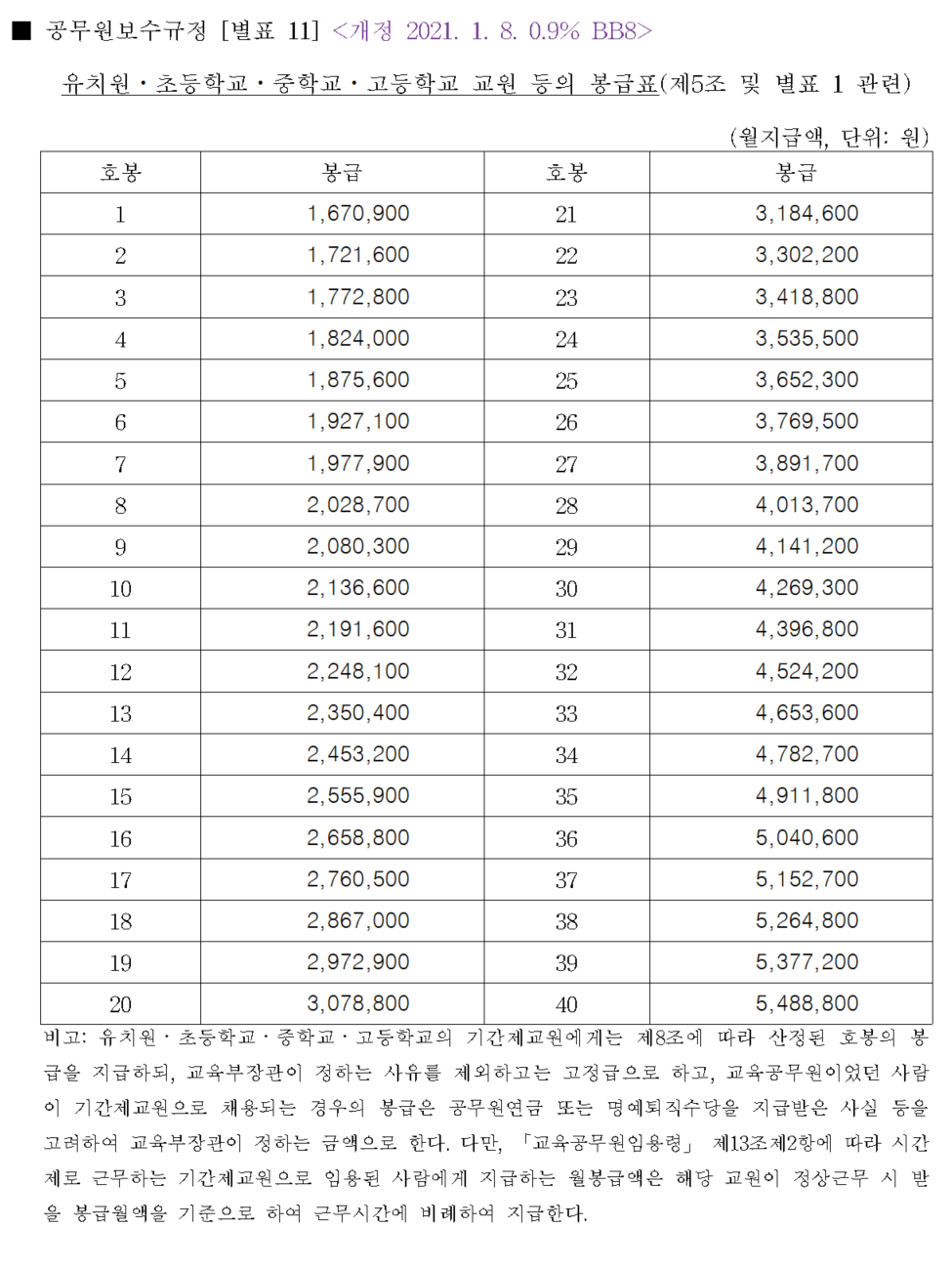 교육공무원인 교사의 경우에도 2021년 호봉표에 대한 공식 발표가 아직 이루어지지 않았습니다. 따라서, 정확한 봉급 변동 사항은 아직 알 수 없지만, 일반직 공무원과 마찬가지로 0.9%의 인상이 있을 것으로 예상됩니다.